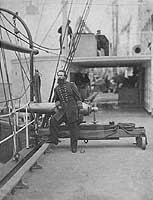 Photo #: NH 91416 Rear Admiral David Dixon Porter, USN, Commander, North Atlantic Blockading Squadron. On the main deck of his flagship, USS Malvern, circa 1864, leaning on a slide carriage-mounted heavy 12-pounder Dahlgren smooth-bore howitzer. Photographed by Alexander Gardner. The original is an albumen silver print. This photograph was used as the basis for an engraving published in Harper's Weekly, 21 January 1865. Courtesy of the Naval Historical Foundation. U.S. Naval Historical Center Photograph. Online Image: 100KB; 565 x 765 pixels |
