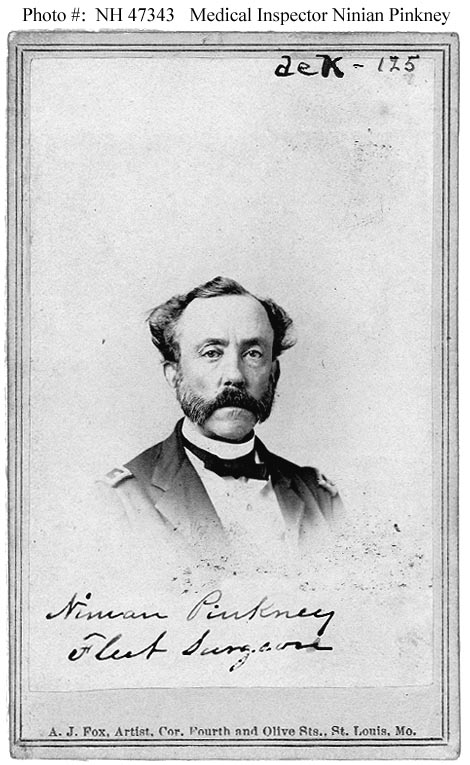 Ninian Pinkney, a native of Maryland, was appointed an Assistant Surgeon in the Navy in March 1834, and attained the rank of Surgeon in 1841. During much of the Civil War, he was Fleet Surgeon of the Mississippi Squadron, serving on board the hospital steamer Red Rover during much of that time. Dr. Pinkney was promoted to the rank of Medical Director in March 1871. He retired in June 1873 and died on 15 December 1877.