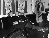 Photo #: NH 54894 Admiral James O. Richardson, USN (left), Commander in Chief, U.S. Fleet Relaxing in Flag Quarters on board his flagship, USS Pennsylvania (BB-38), circa January-May 1940. With him are (center) Admiral Charles P. Snyder, Commander, Battle Force, U.S. Fleet, and (right) Vice Admiral William S. Pye, Commander Battleships, Battle Force. Note pipe radiator on the bulkhead, to the right, open porthole covers and leather-covered furniture. U.S. Naval Historical Center Photograph. Online Image: 91KB; 740 x 600 pixels |