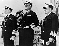 Photo #: NH 77336 Admiral James O. Richardson, USN (center), Commander in Chief, U.S. Fleet Observes fleet maneuvers from on board his flagship, USS Pennsylvania (BB-38), circa January-May 1940. With him are (left) Admiral Charles P. Snyder, Commander, Battle Force, U.S. Fleet, and (right) Vice Admiral William S. Pye, Commander Battleships, Battle Force. Note binoculars. U.S. Naval Historical Center Photograph. Online Image: 90KB; 740 x 615 pixels |