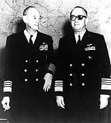 Photo #: 80-G-308561 Vice Admiral John S. McCain, Sr., Commander, Task Force 38, and Commander John S. Thach, USN, Task Force 38 Operations Officer Working on operations plans in the Flag Plot spaces on board USS Hancock (CV-19), circa November 1944-January 1945. Photograph was received 29 March 1945. Official U.S. Navy Photograph, now in the collections of the U.S. National Archives. Online Image: 84KB; 655 x 675 pixels Reproductions of this image may also be available through the National Archives photographic reproduction system. |