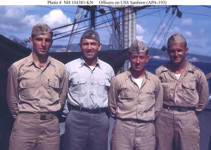 Holding binoculars on the bridge of USS Sanborn (APA-193),