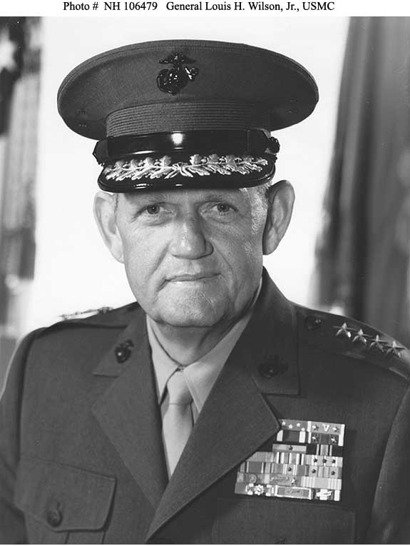 General in March 1970, Wilson commanded I Marine Amphibious Force, Third Marine Division, at Okinawa. In April 1971 he returned to Quantico for service at the Marine Corps Development and Education Command. He was promoted to Lieutenant General in August 1972 and soon took command of the Fleet Marine Force, Pacific. In July 1975, with the rank of General, Wilson became the the Twenty-Sixth Commandant of the Marine Corps, serving in that post until his retirement at the end of June 1979. General Louis H. Wilson Jr. died at Birmingham, Alabama on 21 June 2005 and is buried in Arlington National Cemetery, Arlington, Virginia.
