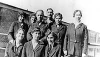Photo #: NH 65575 Personnel of the Payroll Department, Bureau of Navigation At the rear of one of the wings of the Navy or Munitions Building, Washington, D.C., December 1918. The people at right are (from right): Chief Shoales, unknown, Cora Dell Croft, Chief C.G. Patterson and Irene Haddigan. Eighth girl from left (marked by "x") is Frances Gormley. Others present are unidentified. Courtesy of Mrs. Mabel Croft Graham, 1968. U.S. Naval Historical Center Photograph. Online Image: 81KB; 740 x 470 pixels |