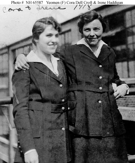 Photo #: NH 65587 Yeomen (F) Cora Dell Croft (left) and Irene Haddigan At the Main Navy or Munitions Building, Washington, D.C., in 1918, when they were serving in the Bureau of Navigation's Payroll Department. Courtesy of Mrs. Mabel Croft Graham, 1968. U.S. Naval Historical Center Photograph. Online Image: 87KB; 560x 675 pixels |