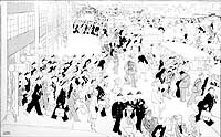 Photo #: NH 92384 "Quitting Time" Cartoon by Gluyas Williams, depicting Navy, civilian and military personnel exiting the "Main Navy" and "Munitions" Buildings in Washington, D.C., during World War II. Note bus at right with destination sign for Chevy Chase Circle. Courtesy of the National Park Service. U.S. Naval Historical Center Photograph. Online Image: 128KB; 740 x 485 pixels |