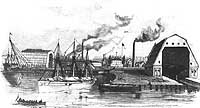 Also in front of the Commandant's Office, but closer to the river, a large pile of coal was much in evidence, fuel for ships and for the furnaces and steam boilers of the yard's industries. Among the factory buildings, tall smokestacks further attested to coal's importance to "iron-age" industry.