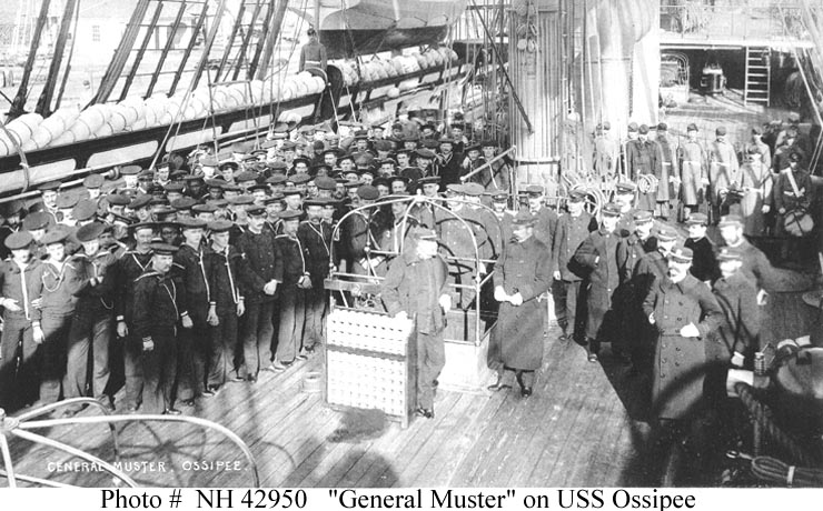 Photo #: NH 42950 USS Ossipee (1862-1891) "General Muster" on board, circa 1887-88. The ship's Commanding Officer, Commander William Bainbridge Hoff, is in center, leaning on the grating rack. Note Marine sentry at the gangway, hammock stowage, and large percentage of black sailors among the crew at left. U.S. Naval Historical Center Photograph. Online Image: 102KB; 740 x 460 pixels |
