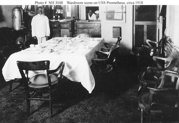 Photo #: NH 3048 USS Prometheus (Repair Ship # 3) Wardroom Mess table ready for a meal, circa 1919-20. Three Stewards are standing by in the background. U.S. Naval Historical Center Photograph. Online Image: 85KB; 740 x 510 pixels |