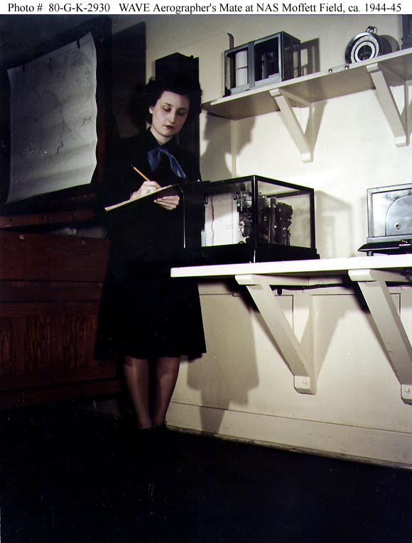 Photo #: 80-G-K-2930 (Color) Naval Air Station, Moffett Field, California WAVE Aergrapher's Mate 2nd Class Ethel E. Helter takes readings from a weather recording instrument, circa 1944-45. Official U.S. Navy Photograph, now in the collections of the National Archives. Online Image: 63KB; 580 x 765 pixels Reproductions of this image may also be available through the National Archives photographic reproduction system. |
