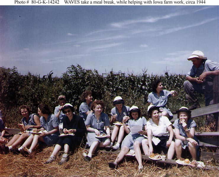 Photo #: 80-G-K-14242 (Color) WAVES from the Cedar Falls, Iowa, yeoman school Take a meal break in an Iowa seed corn field, while helping de-tassel corn stalks during a critical rural labor shortage, circa 1944. More than 150 WAVES helped out during the operation. Official U.S. Navy Photograph, now in the collections of the National Archives. Online Image: 119KB; 740 x 600 pixels Reproductions of this image may also be available through the National Archives photographic reproduction system. |