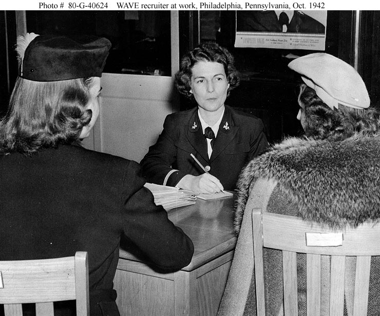 Photo #: 80-G-40624 WAVES recruiting activities Ensign May Herrmann talks to two young women concerning enlistment in the Navy Women's Reserve, at the Officer Procurement office, Philadelphia, Pennsylvania, 30 October 1942. Official U.S. Navy Photograph, now in the collections of the National Archives. Online Image: 107KB; 740 x 615 pixels Reproductions of this image may also be available through the National Archives photographic reproduction system. |