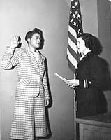 Photo #: 80-G-47027 Harriet Ida Pickens Is sworn in as an Apprentice Seaman by Lieutenant Rosamond D. Selle, USNR, at New York City. In December 1944, she became one of the Navy's first two African-American "WAVES" officers. Photograph released 16 November 1944. Official U.S. Navy Photograph, now in the collections of the National Archives. Online Image: 73KB; 590 x 765 pixels Reproductions of this image may also be available through the National Archives photographic reproduction system. |