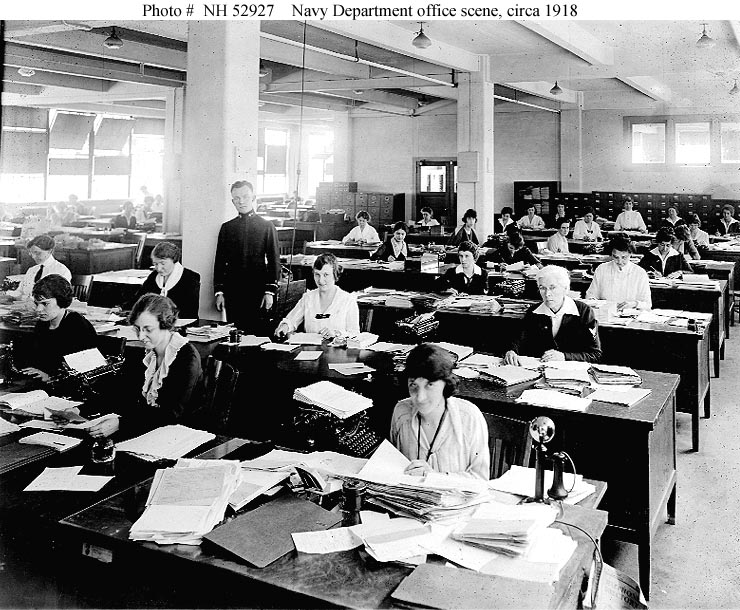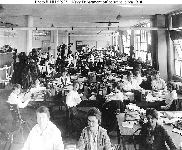 Photo #: NH 52914 Navy Department, Washington, D.C. Military and civilian personnel in an office in the Main Navy or Munitions Buildings, 1919. Most of the women present are Navy Yeomen (F). Note "pigeonholes"for document forms in the left background, typewriters, and name tags for "Miss Davis" (left center) and "Mr. McArt" (right center, with a Chief Yeoman seated at that desk). U.S. Naval Historical Center Photograph. Online Image: 112KB; 740 x 605 pixels |
