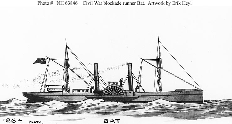 Bat, a 750-ton (burden) Owl class side-wheel steamship, was built in Liverpool, England, in 1864 for the Confederate States Government. Though maintaining British commercial registry, she was manned by the Confederate Navy with the intent of running badly needed supplies and equipment through the Federal blockade of the Southern coast. On her first such voyage, Bat was captured by USS Montgomery as she attempted to enter the port of Wilmington, North Carolina, on 10 October 1864.