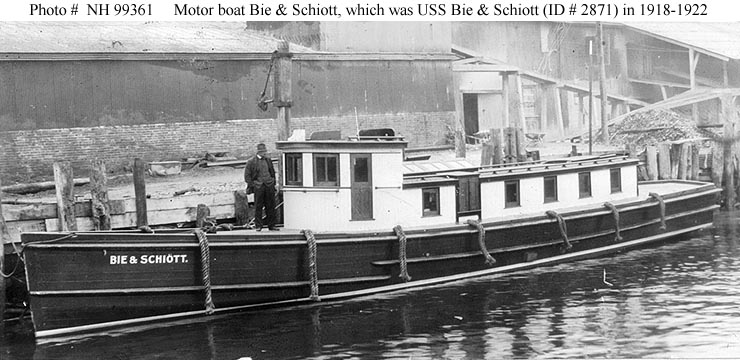 Bie & Schiott, a 64-foot motor boat, was built in 1918. Purchased from her Norfolk, Virginia, owner soon after completion, she was placed in commission as USS Bie & Schiott (ID # 2871) in mid-March 1918. Assigned to the Fifth Naval District, she was employed on transportation duties for the next several years. In 1920 she was classified as a district patrol vessel and became YP-2871. The craft was sold in April 1922.