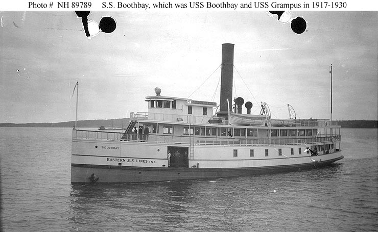 Boothbay, a 334 gross ton coastal ferry steamer, was built at Philadelphia, Pennsylvania, in 1907. In late 1917, when she was based at Boston, Massachusetts, she was commandeered by the Navy and placed in commission in mid-December as USS Boothbay (ID # 1708). For the remainder of World War I, and for more than a decade afterwards, she was employed carrying personnel and materiel between the Washington Navy Yard, D.C., and the Ordnance facilities at Indian Head, Maryland, and Dahlgren, Virginia. Renamed Grampus in November 1920, the ferry was decommissioned in December 1930 and later sold to a Norfolk, Virginia, shipowner.