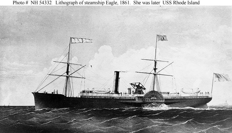 Eagle, a 1517-ton side-wheel steamship, was launched in September 1860 at New York City under the name John P. King. She was badly damaged by fire in December 1860, following her first trials, but was rebuilt and renamed Eagle. The U.S. Navy acquired her in June 1861 and commissioned her the next month as USS Rhode Island. Sold out of Naval service in October 1867, she was subsequently employed as a merchant steamer, under the name Charleston, until about 1885.