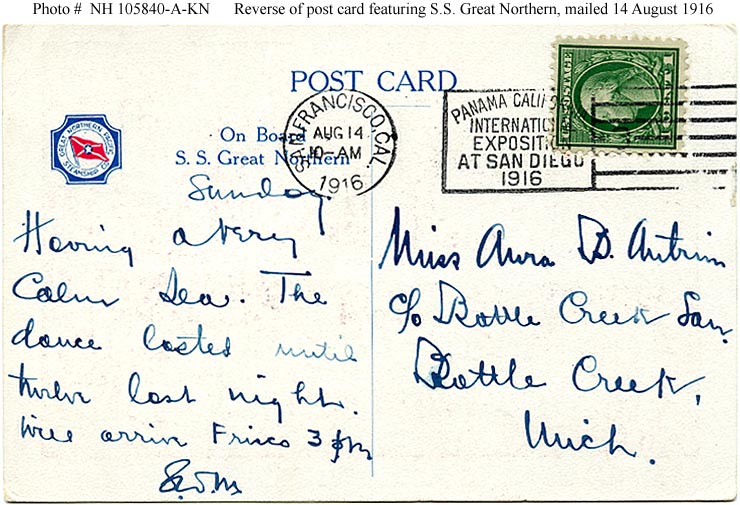Photo #: NH 105840-A-KN (color) S.S. Great Northern (American Passenger Liner, 1915) Reverse of a post card published by the Great Northern Pacific Steamship Company for sending messages written on the ship. This card, mailed at San Francisco, California, on 14 August 1916 with a cancellation stamp for that year's Panama-California International Exposition, San Diego, California, has a message describing activities on board Great Northern. See Photo # NH 105840-KN for a view of the front side of this card, with an artwork depicting S.S. Great Northern entering the Golden Gate. This ship served as USS Great Northern (ID # 4569) in 1917-1919 and USS Columbia (AG-9) in 1921-1922. Donation of Charles R. Haberlein Jr., 2008. U.S. Naval Historical Center Photograph. Online Image: 105KB; 740 x 505 pixels |