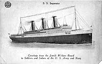 Photo #: NH 105837 Jewish Welfare Board Soldiers and Sailors Post Card Front side of a card issued to U.S. servicemen during the World War I era. It features a view of S.S. Imperator, which served as USS Imperator (ID # 4080) in 1919. For a view of the reverse of this card, pre-printed to facilitate the sender's announcement of destination, see Photo # NH 105837-A. Donation of Charles R. Haberlein Jr., 2008. U.S. Naval Historical Center Photograph. Online Image size: 90KB; 740 x 490 pixels |