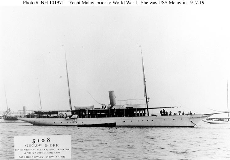 Malay, a 173-ton steam yacht, was built at Chester, Pennsylvania, in 1898. The Navy leased her in April 1917 for World War I service, placing her in commission the following June as USS Malay (SP-735). After spending World War I on patrol service off the Atlantic Coast, Malay was returned to her owner in March 1919.