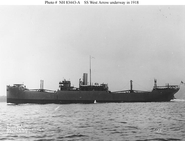 West Arrow, a 5742.6 gross ton freighter, was built at Seattle, Washington, in 1918 as part of the Nation's World War I industrial effort. She was inspected for possible Navy use, and assigned the registry ID # 2585, but was not taken over and remained in civilian hands.