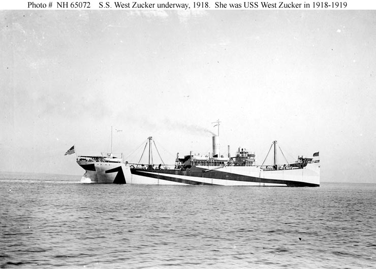 S.S. West Zucker, a 5808 gross ton (12,186.5 tons displacement) freighter built by the Los Angeles Shipbuilding and Drydock Company of Los Angeles, California, was completed in November 1918. She was turned over to the Navy at that time and placed in commission as USS West Zucker (ID # 3584). Early in January 1919 the ship left the West Coast with a cargo of flour, which she delivered at Hampton Roads, Virginia, in March. Decommissioned late in that month, West Zucker was returned to the U.S. Shipping Board, which retained her until 1933, when she was abandoned.