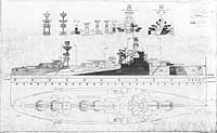 Like the other Measure 31a battleship schemes, Design 7B was relatively dark, but lighter overall than was typical of Measure 31 designs. Colors used on vertical surfaces included Navy Blue (5-N), Ocean Gray (5-O) and Haze Gray (5-H). Decks and other exterior horizontal surfaces were painted Deck Blue (20-B). For photographs of Arkansas wearing Measure 31a, Design 7B, see Photo #s: 19-N-74310 and 19-N-74310. These show the ship's port side. We hold no photographs showing her starboard side in Design 7B.