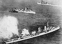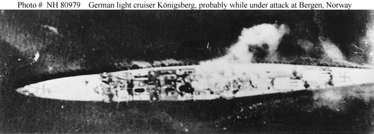 Thus, Königsberg's first real combat operation was the invasion of Norway in April 1940. Her mission in this risky undertaking was the occupation of the west coast port city of Bergen. In company with her sister, Köln, and several other warships, Königsberg was loaded with German Army troops and secretly left Germany for the long and potentially dangerous run up to the target area. The strike force approached Bergen during the early morning of 9 April, offloaded some of their troops to smaller craft and engaged the defending Norwegian shore batteries. Königsberg received serious damage in this engagement, which restricted her speed and prevented her from leaving the area with her companions. She was also the target of a British air raid on the 9th, but was not hit. On the following day, 10 April 1940, the cruiser was tied up to a Bergen quay when several British "Skua" dive bombers delivered a deadly attack, making five hits and one close near miss that set her afire, holed her hull and killed many crewmen. It soon became clear that she could not be saved. After her crew abandoned ship, Königsberg capsized to port and sank. Her hull was refloated in July 1942 and later turned upright. However, the hulk sank again in 1944 and, following the end of World War II, was broken up.