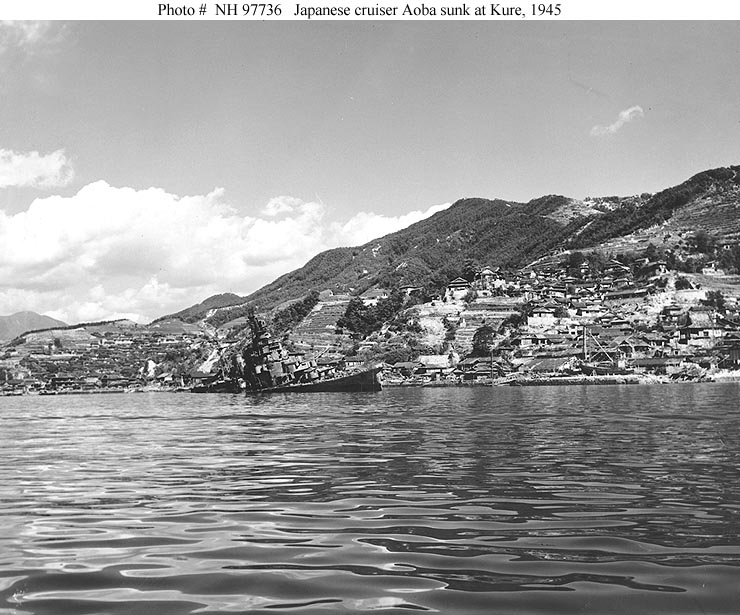 Photo #: NH 97737 Aoba (Japanese Heavy Cruiser, 1927) Resting on the bottom near the Kure Navy Yard, Japan, 12 October 1945. She had been sunk in air attacks in July 1945. The original photograph came from Rear Admiral Samuel Eliot Morison's World War II history project working files. U.S. Naval Historical Center Photograph. Online Image: 124KB; 740 x 615 pixels |