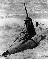 Photo #: 80-G-17079 HA-19 (Japanese "Type A" midget submarine) In the surf on an eastern Oahu beach, after it unsuccessfully attempted to enter Pearl Harbor during the 7 December 1941 Japanese attack. Photographed on or shortly after 8 December 1941. Official U.S. Navy Photograph, now in the collections of the National Archives. Online Image: 132KB; 595 x 765 pixels Reproductions of this image may also be available through the National Archives photographic reproduction system. |