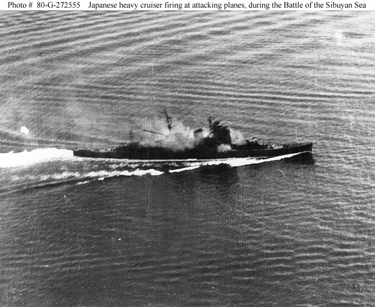 Photo #: 80-G-272555 Battle of the Sibuyan Sea, 24 October 1944 Japanese heavy cruiser Haguro firing at attacking U.S. carrier planes during the Sibuyan Sea action. Official U.S. Navy Photograph, now in the collections of the National Archives. Online Image: 126 KB; 740 x 605 pixels Reproductions of this image may also be available through the National Archives photographic reproduction system. |