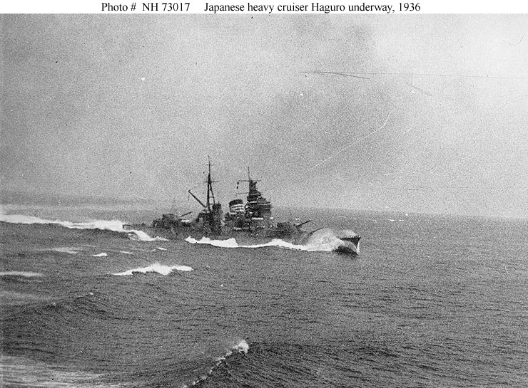 Photo #: NH 73016 Haguro (Japanese Heavy Cruiser, 1929) Underway in April 1936. Donation of Kazutoshi Hando, 1970. U.S. Naval History and Heritage Command Photograph. Online Image: 119KB; 740 x 575 pixels |