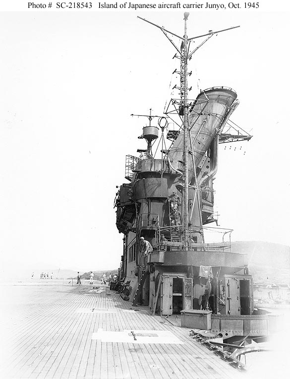 Photo #: USMC 150351 Junyo (Japanese aircraft carrier, 1942) View of the ship's island, taken at Sasebo, Japan, circa Fall 1945, following the end of World War II. Note her radar antennas and outward-raked smokestack. U.S. Marine Corps Photograph. Online Image: 63KB; 740 x 595 pixels |