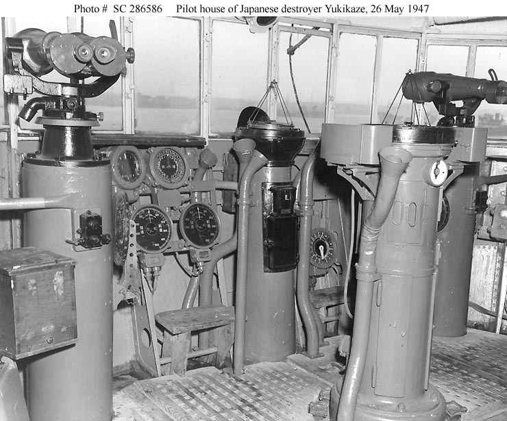 Photo #: SC 286586 Yukikaze (Japanese Destroyer, 1940) View in the ship's pilot house, taken at Tokyo, Japan, on 26 May 1947, after she had served as a repatriation ship for Japanese nationals. Yukikaze was to be on display for representatives of the major Allied powers. She later became the Republic of China's destroyer Tan Yang. Photographed by Kaye Calmus. Note the binoculars, voice tubes and wooden deck gratings. Photograph from the Army Signal Corps Collection in the U.S. National Archives. Online Image: 108KB; 740 x 615 pixels Reproductions of this image may also be available through the National Archives photographic reproduction system. |