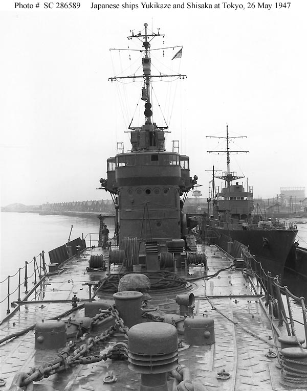 Photo #: SC 286589 Yukikaze (Japanese Destroyer, 1940) View on the ship's deck, looking aft from her bow. Taken at Tokyo, Japan, on 26 May 1947, where she is to be exhibited to representatives of the leading Allied powers. The escort ship Shisaka is at right. Both ships had been employed repatriating Japanese nationals from overseas, and were stripped of armament for this service. They were later transferred to the Chinese Navy. Note Yukikaze's deck plating, with raised plates attached for non-skid purposes, and her anchor and line handling equipment. Photographed by Kaye Calmus. Photograph from the Army Signal Corps Collection in the U.S. National Archives. Online Image: 82KB; 600 x 765 pixels Reproductions of this image may also be available through the National Archives photographic reproduction system. |