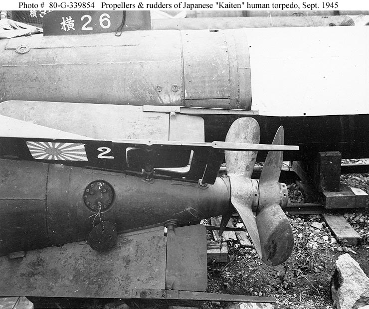 Photo #: 80-G-339854 Japanese "Kaiten" Type 2 or 4 Human Torpedo View of the afterbody, showing rudders and propellers, with other "Kaiten" in the background, at the Yokosuka Naval Base, Japan, 7 September 1945. Japanese "kanji" character painted on the fairwater of "Kaiten" number 26 is "yoko", probably a unit marking for Yokosuka naval base. Top fin of the "Kaiten" in the foreground features a painted Japanese navy flag. Official U.S. Navy Photograph, now in the collections of the National Archives. Online Image: 78KB; 740 x 620 pixels Reproductions of this image may also be available through the National Archives photographic reproduction system. |