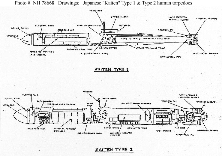 Photo #: NH 78668 Japanese Human Torpedoes: "Kaiten" Type 1 (top) and "Kaiten" Type 2 (bottom) Sketch inboard profile plans, 1945. Copied from "Extracts from Small Battle Units of Foreign Powers, Appendix III: Japanese Midget Submarines and Explosive Motor Boats", page 40 (top). U.S. Naval Historical Center Photograph. Online Image: 92KB; 740 x 520 pixels |