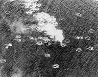 Photo #: 80-G-331274 Japanese Type A or Type C Midget Submarine Under attack by three PV-1 "Ventura" patrol bombers of the Seventh Fleet, in Davao Gulf, Mindanao, Philippine Islands, 27 May 1945. The submarine, which has a long float alongside its port side, has just been struck by a rocket and is surrounded by bullet splashes from the planes' .50 caliber machine guns. Official U.S. Navy Photograph, now in the collections of the National Archives. Online Image: 150KB; 740 x 610 pixels Reproductions of this image may also be available through the National Archives photographic reproduction system. |