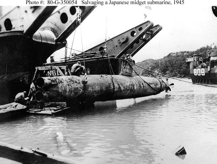 Photo #: 80-G-350054 Japanese Type A or Type C Midget Submarine Under salvage by USS Catclaw (AN-60) and USS Baretta (AN-41) at Untan Ro (Okinawa ?), in July-September 1945. The submarine had been sunk there by U.S. planes during the Okinawa campaign. USS LST-809 is in the right background. Photograph was released for publication on 21 January 1946. Official U.S. Navy Photograph, now in the collections of the National Archives. Online Image: 92KB; 740 x 560 pixels Reproductions of this image may also be available through the National Archives photographic reproduction system. |
