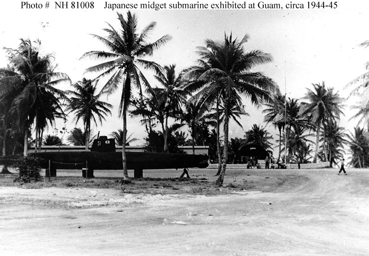 Photo #: NH 81008 Japanese Type A or Type C Midget Submarine On display at Camp Dealey rest camp, Guam, circa 1944-45. The number "51" on its conning tower indicates that it may be Ha-51, which was a Type A midget sub. Courtesy of the Naval Historical Foundation. Collection of Lieutenant O.E. Wightman. U.S. Naval History and Heritage Command Photograph. Online Image: 100KB; 740 x 515 pixels |