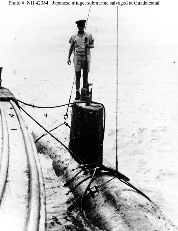 Photo #: NH 42364 Japanese Two-Man Midget Submarine Refloated at Guadalcanal This Type A midget submarine was found scuttled off Guadalcanal in 1943, after the Japanese evacuated their forces on the island. Collection of Vice Admiral Homer N. Wallin. U.S. Naval History and Heritage Command Photograph. Online Image: 76KB; 590 x 765 pixels |
