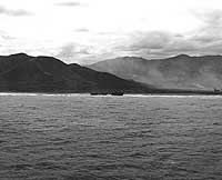 Photo #: 80-G-420836 Changsadong Raid, 15-19 September 1950 Motor whaleboat alongside USS Helena (CA-75) on 19 September 1950, during efforts to save the broached Korean LST Munsan, visible in the center distance. A second Korean LST is at right, with USS Bolster (ARS-38) attempting to pull the stranded ship free. USS Doyle (DMS-34) is partially visible in the upper left. This situation resulted from an attempt to insert South Korean guerillas behind enemy lines north of Pohang. Official U.S. Navy Photograph, now in the collections of the National Archives. Online Image: 162KB; 740 x 615 pixels Reproductions of this image may also be available through the National Archives photographic reproduction system. |