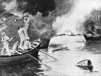 Photo #: NH 79948 Battle of Manila Bay, 1 May 1898 Halftone reproduction of an artwork by E.T. Smith, 1901, depicting a boat party from USS Petrel setting fire to Spanish gunboats near the battle's end. The party was under the direction of Chief Carpenter's Mate Franz A. Itrich, who was awarded the Medal of Honor for this operation. Copied from Deeds of Valor, Vol.II, page 354, published by the Perrien-Keydel Co., Detroit, Michigan, 1907. U.S. Naval Historical Center Photograph. Online Image: 94,444 bytes; 740 x 595 pixels |