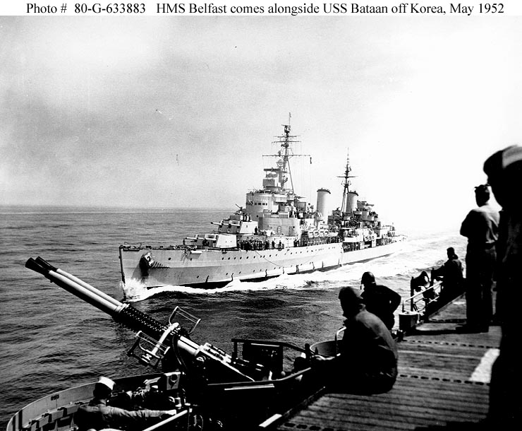Photo #: 80-G-633883 HMS Belfast (British Light Cruiser, 1939) Coming alongside USS Bataan (CVL-29) while operating off the coast of Korea on 27 May 1952. One of Bataan's 40mm twin gun mounts is in the left foreground. Official U.S. Navy Photograph, now in the collections of the National Archives. Online Image: 97KB; 740 x 610 pixels Reproductions of this image may also be available through the National Archives photographic reproduction system. |