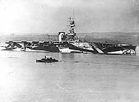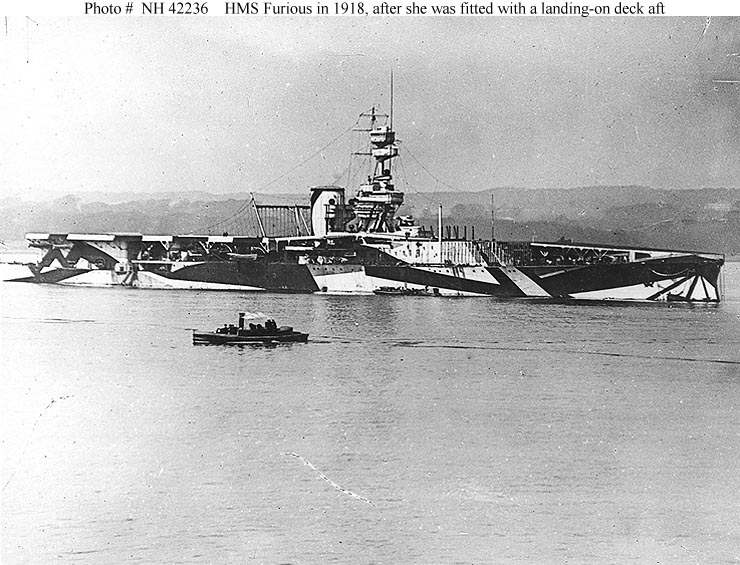 Her wartime aircraft landing arrangements having proved very unsatisfactory, Furious was laid up in reserve in late 1919. After futher experience with other aircraft carriers, she was massively reconstructed, emerging in August 1925 as a 22,450-ton ship with upper and lower hangars, topped by a long flight deck clear of obstructions, with a shorter aircraft launching deck at the bow. This configuration established a pattern for other British and Japanese aircraft carriers of that era.