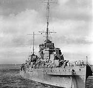 HMS Leander, the 7289-ton (standard displacement) lead ship of a class of five light cruisers, was built at Devonport, England. Completed in March 1933, she served with the Royal Navy until April 1937, when she was transferred to New Zealand and became HMNZS Leander. The cruiser mainly served in the Pacific and Indian Ocean areas until 1940, then operated in the Mediterranean and Red Sea. On 29 October 1940 her embarked aircraft attacked a fish cannery at Mogadishu, Somalia, and on 27 February 1941 she encountered and sank the Italian auxiliary cruiser RAMB 1 near the Maldive Islands.
