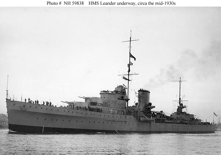 Photo #: NH 59838 HMS Leander (British Light Cruiser, 1933) Underway in harbor, circa the mid-1930s. U.S. Naval Historical Center Photograph. Online Image: 47KB; 740 x 520 pixels |