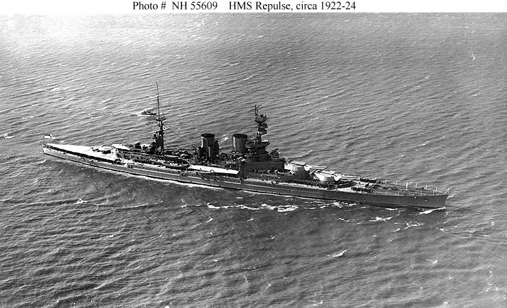 Photo #: NH 55608 HMS Repulse (British Battlecruiser, 1916-1941) Probably photographed at the time of her 1923-24 World cruise. Note the extensive side armor, added during her 1919-22 refit, and aircraft flying-off platforms atop "B" and "X" turrets. U.S. Naval History and Heritage Command Photograph. Online Image: 104KB; 740 x 480 pixels |