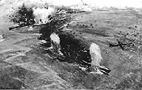 Photo #: NH 60566 Loss of HMS Prince of Wales and HMS Repulse, 10 December 1941 Photograph taken from a Japanese aircraft during the initial high-level bombing attack. Repulse, near the bottom of the view, has just been hit by one bomb and near-missed by several more. Prince of Wales is near the top of the image, generating a considerable amount of smoke. Japanese writing in the lower right states that the photograph was reproduced by authorization of the Navy Ministry. Donation of Mr. Theodore Hutton, 1942. U.S. Naval History and Heritage Command Photograph. Online Image: 82KB; 525 x 765 pixels |
